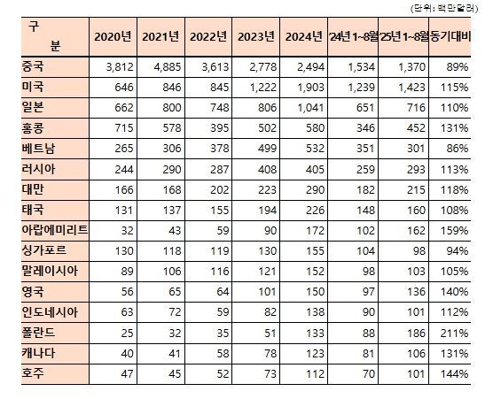 관세청에 따르면 우리나라 화장품 수출액은 올해 8월 말까지 73억 달러를 넘어서며 지난해 같은 기간보다 14% 증가했으며, 중국, 미국, 일본으로의 화장품 수출이 전체 수출액의 48%를 차지하고 있다.