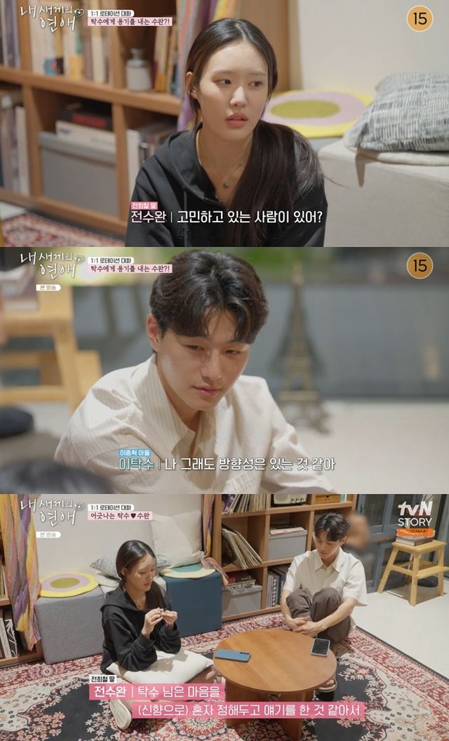 전수완은 이탁수에게 "고민하는 사람이 있냐"고 질문하며 용기를 냈고, 이탁수는 "방향성은 있는 거 같다. 솔직하게 얘기하면 첫날에 신향 님하고 얘기 엄청 많이 했다. 취향도 엄청 잘 맞았다. 근데 2-3일 만에 (너를 만나고) 일이 많아진 것 같다"며 전수완과 이신향 두 사람에게 마음이 있음을 드러냈다.