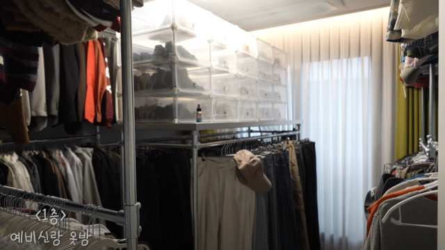이어 신지는 1층 왼쪽 부근으로 이동하며 “예비신랑의 드레스룸이다”라고 공간을 공개했다. 드레스룸에는 남성용 팬츠와 티셔츠가 가지런히 행거에 걸려 있어 눈길을 끌었다.