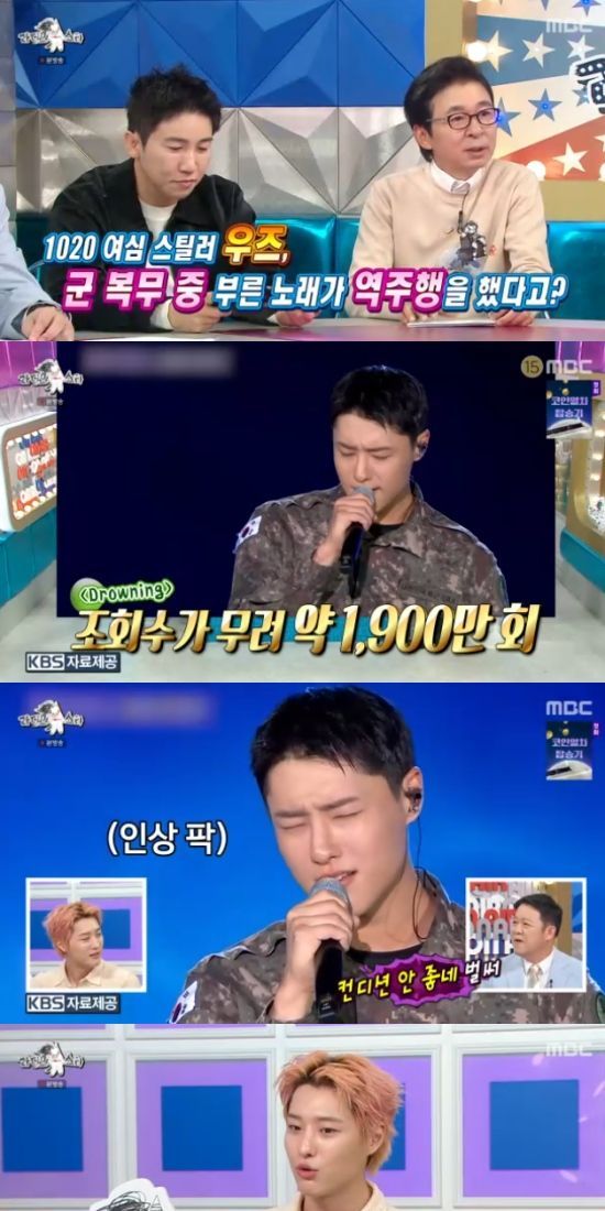이날 방송에서 우즈는 군복무 중 부른 노래 'Drowning'가 역주행을 한 것을 언급하면서 "그 노래가 군대 가기 1년 전에 냈던 노래다. 군대에서 '국군의 날' 특집 무대에서 부른 노래가 터졌다. 지금 조회수가 1,900만"이라고 말해 놀라움을 자아냈다.