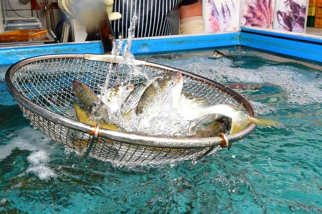 회 식당 수족관에서 주인이 가을 전어들을 뜰채로 옮기고 있다 / 뉴스1