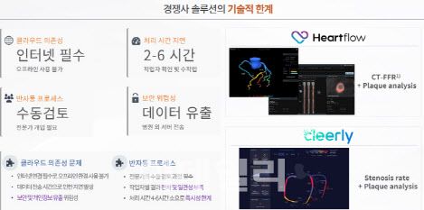 하트플로우의 경우 병원에서 CT 영상을 클라우드에 업로드하면 본사에서 전문가가 분석한 후 다시 병원으로 결과를 전송하는 방식을 취한다. 이 과정에서 환자 데이터가 외부로 나가면서 보안상 우려가 제기되고, 처리 시간도 길어진다는 단점이 있다. 반면 에이아이메딕의 ‘하트메디플러스’는 병원 내 컴퓨터에 설치만 하면 AI와 컴퓨터 시뮬레이션을 통해 즉석에서 분석이 가능하다.