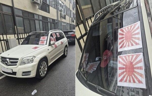 사진 속 차량에는 앞뒤 창문과 운전석 등에 욱일기가 빼곡히 붙어 있었다.