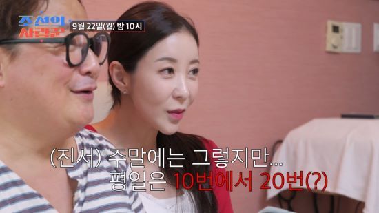 원진서는 "주말에는 그렇지만, 평일에는 10~20번이다"면서 수줍게 끄덕였다. 그리고 윤정수는 "키스는 좀 밤에 해야지...낮에는 그렇다"고 키스에 대한 소신도 밝혔다. 그러자 원진서는 "키스는 오빠가 가끔씩만 해준다"고 털어놔 웃음을 자아냈다.