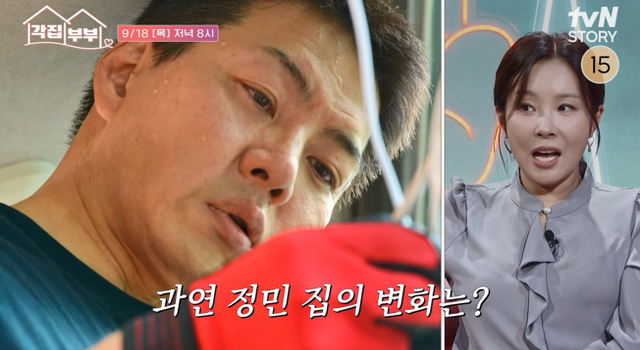 18일 방송되는 tvN STORY '각집부부' 4회에서는 각집 부부들이 오랜만에 만나는 시간이 전파를 탄다. 그런데 24시간 아내 루미코와 가족을 그리워했던 김정민은 위기를 맞는다. 여느 때처럼 스위트 커피 한 잔의 여유를 즐기던 김정민 앞에 아내 루미코가 급습하는데, 불시에 청소 상태를 점검한 결과 경악을 금치 못하는 것.