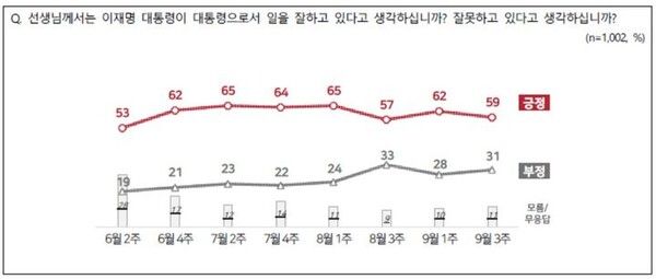 직전 조사(9월1주차)와 비교해 긍정 평가는 3%포인트(p) 내렸고, 부정 평가는 3%p 올랐다.