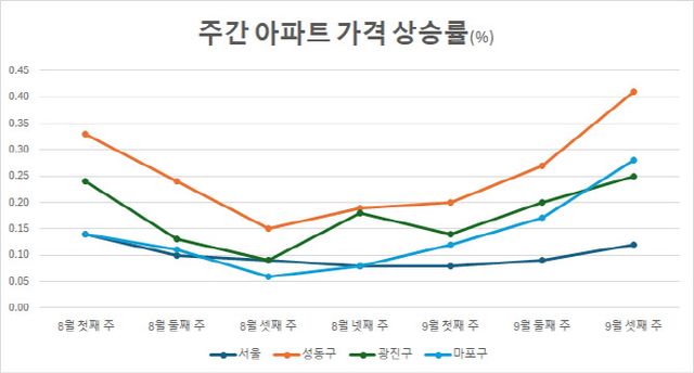 18일 한국부동산원이 9월 셋째 주(9~15일) 주간 아파트 가격 동향을 조사한 결과 서울 아파트 가격은 일주일 새 0.12% 올랐다. 8월 마지막 주와 9월 첫째 주 각각 0.08% 올랐으나 이달 둘째 주 0.09%로 상승폭이 커지더니 2주째 상승폭이 확대됐다.