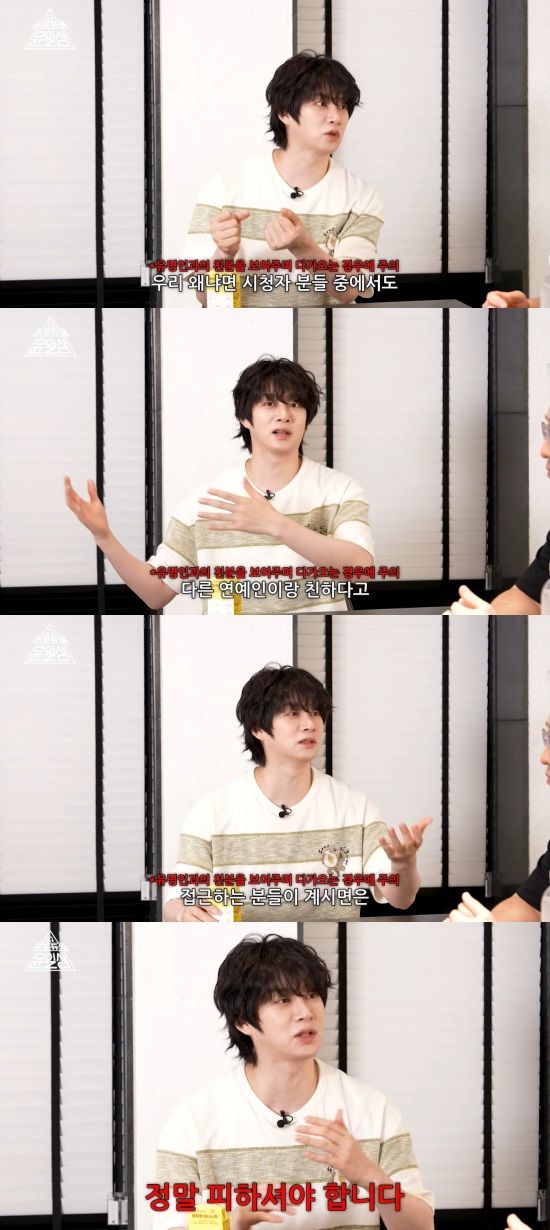 김희철은 "시청자분들도 조심하셔야될 게 형이랑 친하다고, 저랑 친하다고, 다른 연예인하고 친하다고 접근하는 분들이 계시면 정말 피하셔야 한다"고 당부했다.