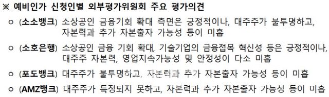 심사 결과의 투명성도 아쉬움이 크다. 금융위는 “전반적으로 미흡했다”는 총평만 남겼을 뿐 평가항목별 심사 점수와 총점 등 구체적인 심사 결과는 전혀 공개하지 않았다. 외부평가위원회 명단조차 비공개다. 심사 과정에서 문제 삼은 ‘투자 의향서’ 제출과 관련해서도 인가 여부가 불투명한 상태에서 민간 투자자가 확약서를 내는 것은 현실적으로 어려운 것 아니냐는 말이 나온다. 파급 효과가 큰 사안인데다 논란거리가 있지만 금융위는 별도 브리핑 없이 5쪽짜리 설명자료로 결론을 대신했다.