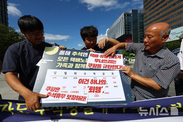 뉴시스 보도에 따르면, 택배노동자과로사대책위원회는 18일 오후 서울 종로구 광화문광장에서 택배노동자 추석 명절 휴식권 보장 촉구