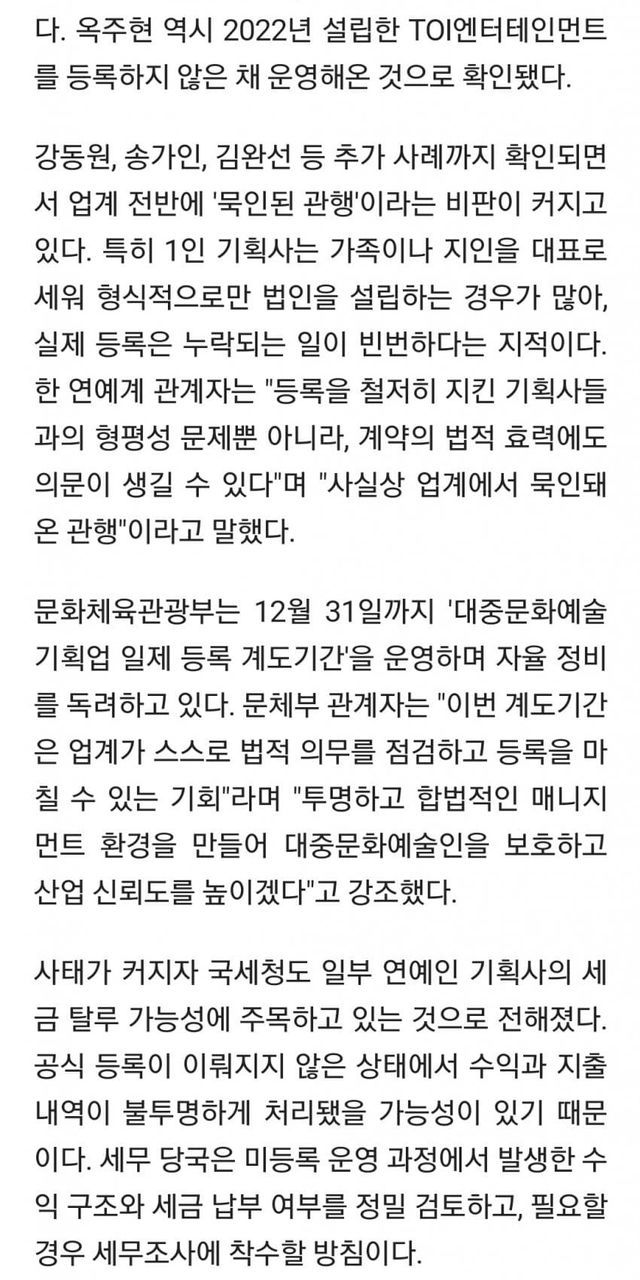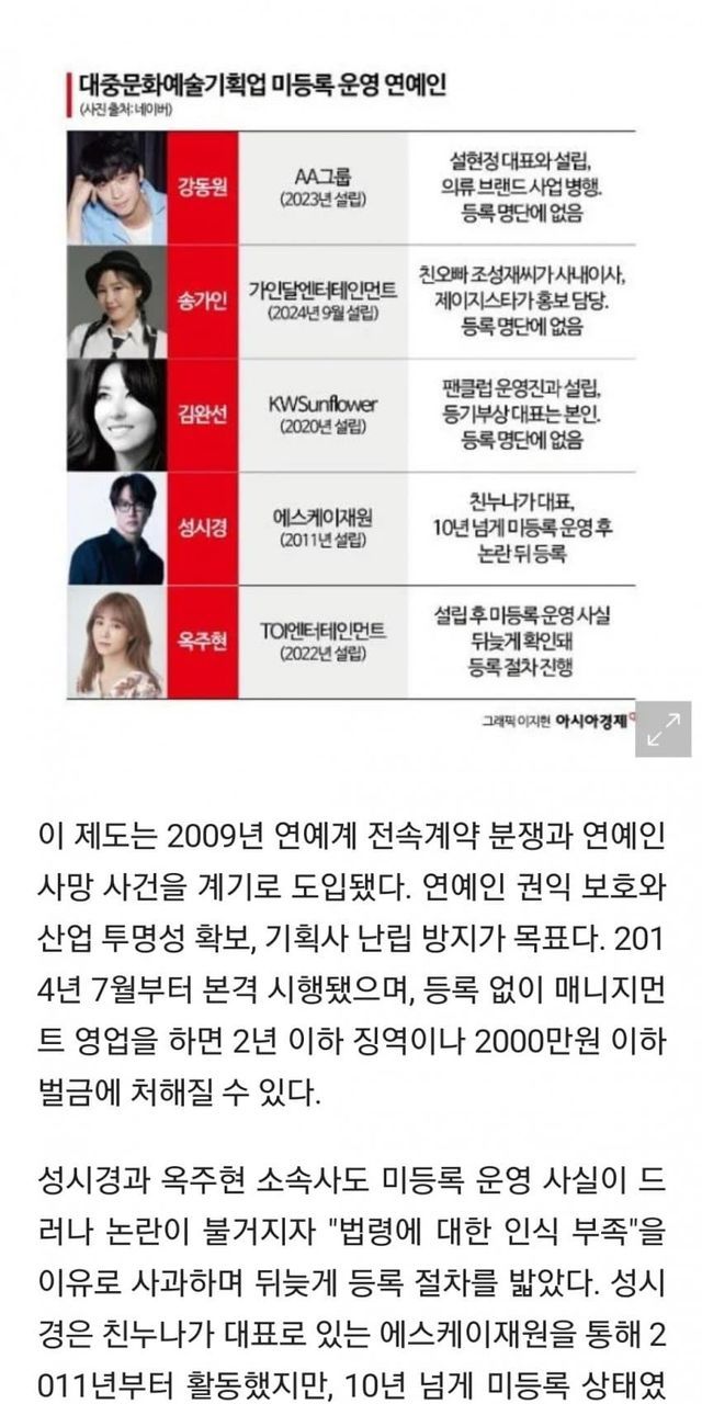 강동원 송가인 김완선까지... 1인 기획사 미등록 파문 확산