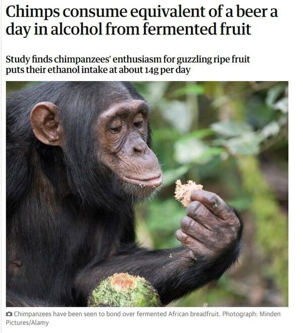 뉴시스 보도에 따르면, 17일(현지시간) 영국 매체 더가디언 보도에 따르면 미국 캘리포니아대 버클리캠퍼스(UC 버클리) 연구진은 국제학술지 사이언스 어드밴시스(Science Advances)를 통해 "야생 침팬지가 하루 평균 약 14g의 순수 에탄올을 섭취하고 있는 것으로 추정된다"고 밝혔다. 이는 맥주 한 잔(355㎖, 알코올 도수 5%)에 해당하는 양이다.
