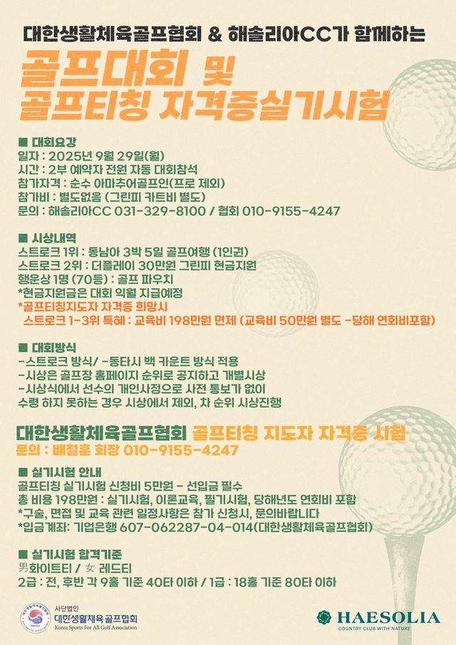 대회는 KPGA, KLPGA 프로 자격이 없는 아마추어 골퍼라면 누구나 참여할 수 있으며, 신청은 해솔리아CC와 대한생활체육골프협회 홈페이지, 네이버 밴드 및 블로그를 통해 가능하다. 시상 혜택도 풍성하다. 스트로크 1~3위 입상자에게는 협회가 발급하는 ‘골프티칭’ 자격증 발급비 면제 혜택(198만 원 상당)이 주어진다. 우승자는 동남아 3박 5일 골프여행권, 준우승자는 더플레이 멤버십 30만 원 현금 회원권이 제공되며, 동타 시에는 백카운트 방식으로 순위가 결정된다.