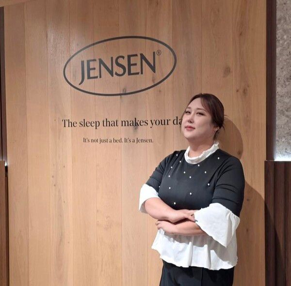 사진 속 풍자는 노르웨이 하이엔드 침대 브랜드 '옌센(JENSEN)'을 배경으로 여러 포즈를 취했다.