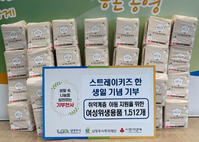 [와이뉴스] 남양주시는 16일 남양주시복지재단이 스트레이키즈 멤버 ‘한’의 팬으로부터 여성용품 1,512개를 기부받았다고 밝혔다. 이번 기부는 ‘한’의 생일(9월 14일)을 기념해 추진됐다.