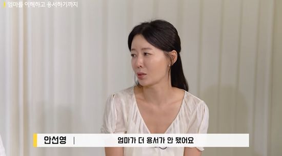 안서영은 "이해는 가지만 용서는 안 됐던 게 사실이다. 어렸을 때 이 사람이 나한테 했던 끊임없는 화풀이를 되갚아주면서 풀고 있다고 생각했다"라며 "엄마가 이미 치매 판정을 받으신 지는 7년이 넘으셨다. 빨리 용서를 했으면 쉬웠을 텐데 작년에 뇌졸중으로 내 눈앞에서 쓰러지는 걸 보고 나서야 (엄마가) 너무 불쌍했다"라고 말했다.