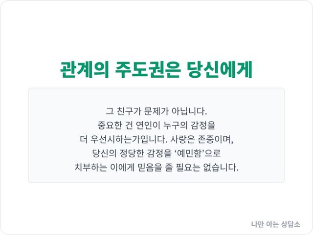 여기서 갈등의 핵심은 ‘바람’이 아니라, ‘우선순위’의 문제가 된다. 그는 당신의 감정적 안정보다, 그 친구와의 관계를 유지할 자신의 자유를 더 중요하게 여기고 있는 것이다.