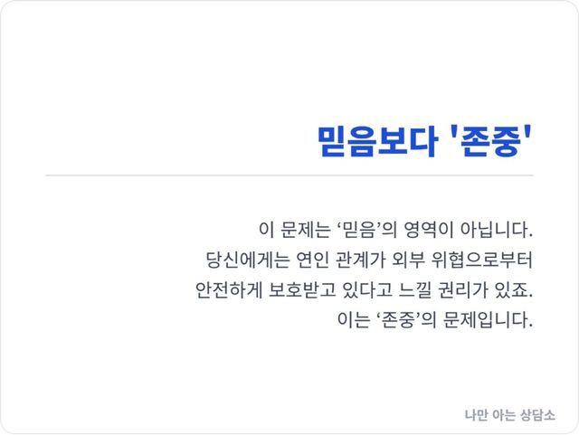 사랑은 믿음의 문제이기도 하지만, 그 이전에 존중의 문제다. 당신의 정당한 감정을 ‘예민함’으로 치부하며 존중하지 않는 사람에게, 당신의 소중한 믿음을 줄 필요는 없다.