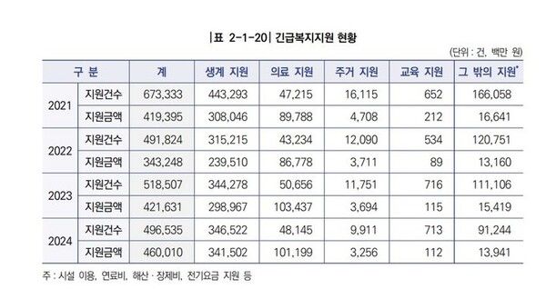 뉴시스 보도에 따르면, 19일 '2024 보건복지 백서'에 실린 긴급복지지원 현황을 보면 작년 총 긴급복지지원 건수는 49만6535건, 국비와 지방비를 합친 지원금액은 4600억1000만원으로 집계됐다.