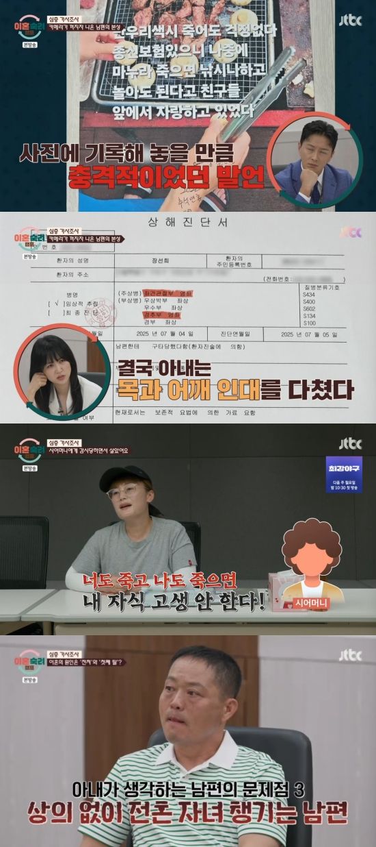 아내는 "2018년 3월 초에 자궁경부암으로 수술을 받았다. 이후 딸을 위해 생명보험을 들었다. 그런데 남편이 '나는 우리 아내가 죽어도 걱정 없다. 보험금 찾아서 놀면서 애 키우면 된다'고 하더라. 이 인간은 나를 죽이고도 남겠다 싶어서 보험 해약을 했다"고 말해 충격을 안겼다.