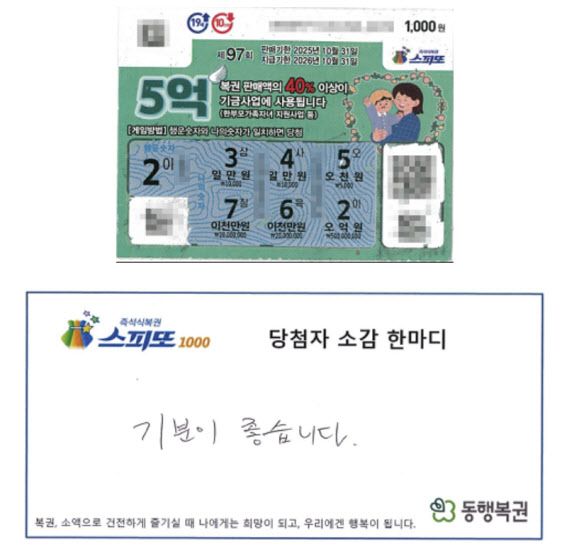 왠지 좋은 예감에 A씨는 그날 오전 일을 마치고 집 근처 복권판매점에 들러 로또와 스피또 복권을 구입했다. 그리고 며칠 뒤 복권을 확인하니 1등 5억에 당첨된 것.