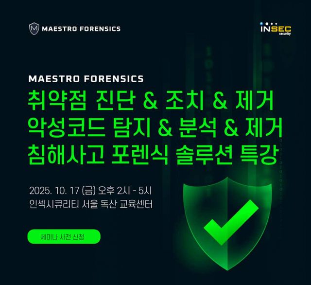 10월 17일 서울 독산 인섹시큐리티 교육센터에서 ‘취약점 진단·악성코드 탐지·침해사고 포렌식 솔루션 특강’을 개최한다고 밝혔다. HCLSoftware·RAPID7·FORTRA·OPSWAT·JoeSandbox 등 글로벌 솔루션과 자사 AI 기반 ‘마에스트로 위즈덤’을 연동한 대응 방안을 데모로 시연할 계획이라고 덧붙였다.