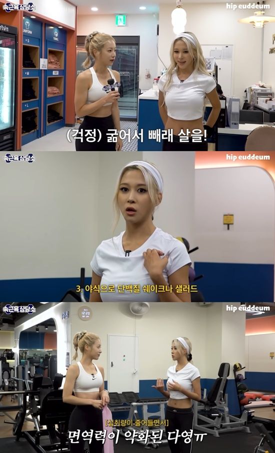 다영은 "매일 아침부터 저녁까지 안무 연습하고 야식은 셰이크나 샐러드 먹었다. 그러다 보니 면역력이 바닥났다. 레몬즙 타서 면역력을 챙겼다"고도 했다. 이어 그는 플랭크 등 자신만의 운동 루틴도 공개했다.