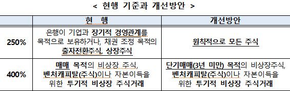은행의 주식 보유 관련 위험가중치도 기존 400%에서 250%로 낮춘다. 단, 단기 매매 목적 투자나 벤처 주식에 한해 400%를 적용하기로 했다.