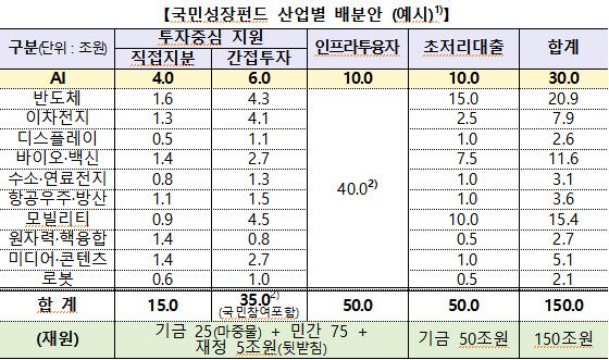 150조원 규모로 조성될 국민성장펀드는 파급 효과가 큰 ‘메가 프로젝트’를 중심으로 자금을 지원하되, 산업별로 최근 성장세 등을 고려해 자금을 배분한다. 인공지능(AI)에 30조원, 반도체에 20조원 이상이 공급될 전망이다. 금융당국 관계자는 “수출·대기업뿐만 아니라 생태계 전반을 구성하는 중소·중견기업에도 연간 10조원 이상을 지원할 것”이라고 설명했다.