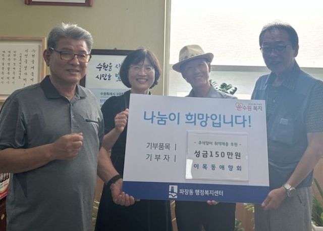 [와이뉴스] 수원시 장안구 파장동은 지난 18일, 이목동 애향회에서 추석을 맞이하여 홀로 계신 어르신과 저소득 취약계층 등 소외된 이웃들에게 힘이 되고자 성금 150만원을 기부했다고 밝혔다.