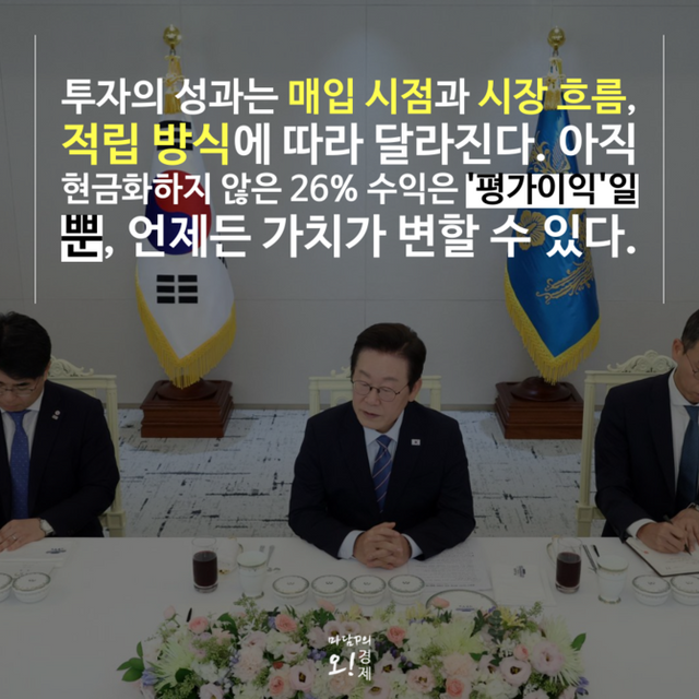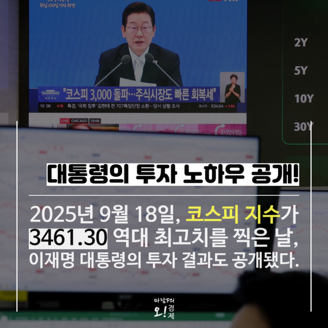 이 대통령은 대선 후보 시절 "임기 동안 총 1억 원을 국내 증시에 투자하겠다"며 매달 100만원씩 5년간 적립 투자 계획을 밝힌 바 있다. 대통령의 투자 성과는 시장 상승에 따른 효과라는 분석이 많지만 장기·분산 투자라는 메시지를 담았다는 점에서 상징성이 크다는 평가다.