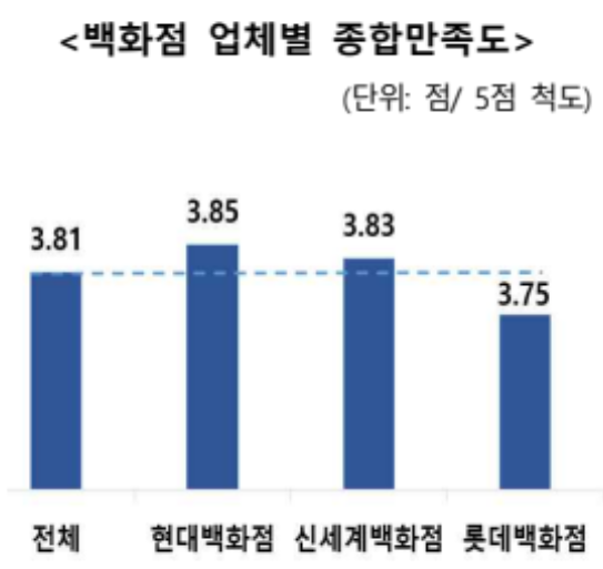 조사 결과, 백화점 3사의 종합만족도는 평균 3.81점(5점 만점)이었다. 업체별로는 현대백화점이 3.85점으로 가장 높았고, 신세계백화점 3.83점, 롯데백화점 3.75점 순으로 나타났다.