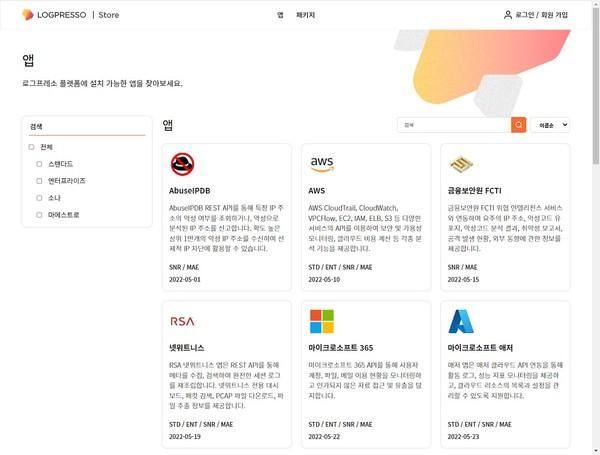 그래서 저희는 “로그프레소 스토어”를 통해 200개 이상의 보안 솔루션과 서비스를 연동할 수 있도록 지원합니다. 스마트폰에 앱 설치하듯, 고객은 새로운 SaaS나 보안 솔루션을 도입해도, 연동 부담 없이 빠르게 확장할 수 있습니다.