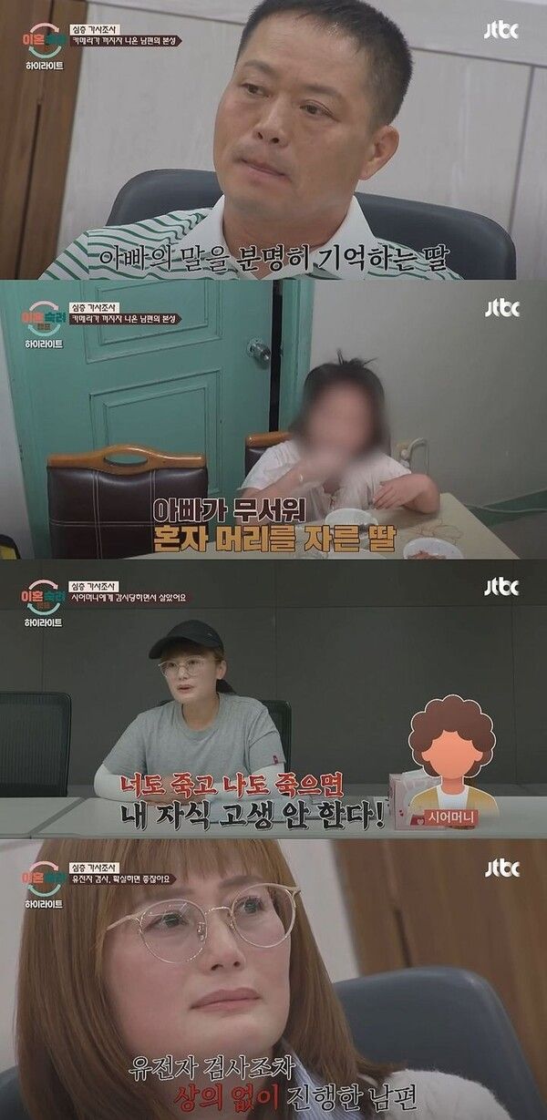 또 아내는 "딸이 만 4세일 때인데 시어머니가 끈으로 딸 목을 감고 당기고 있더라"라며 "'우리 아들이 50살인데 너 언제 키우냐. 너 죽고 나 죽자'하면서 그랬다"고 덧붙였다.