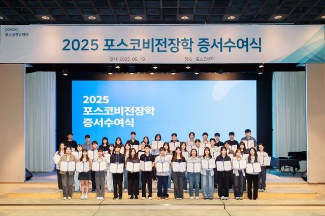 포스코청암재단(이사장 장인화)은 19일 서울 포스코센터에서 제20기 ‘포스코비전장학생’ 장학증서 전달식을 열고, 포항과 광양 지역 출신 대학 신입생 40명을 최종 선발했다고 밝혔다.