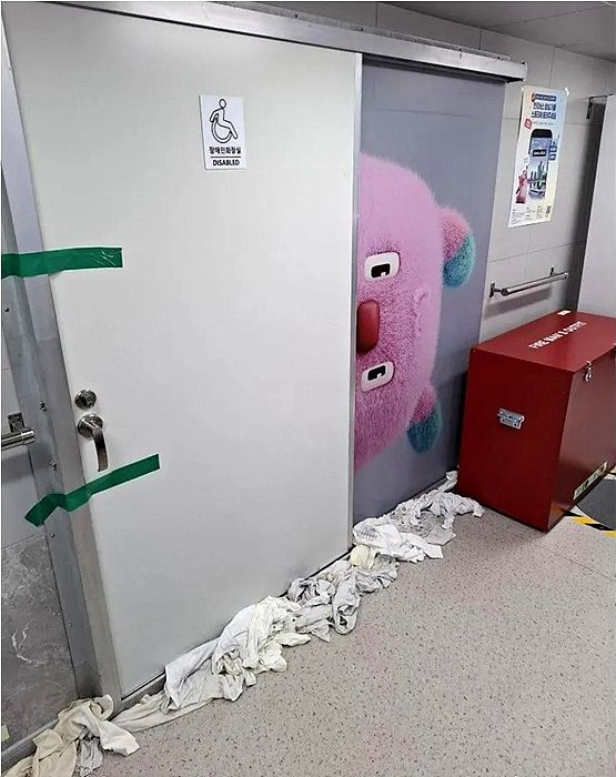 해당 사진에는 문이 청테이프로 붙여져 있었고, 문과 바닥 틈새에는 오물이 흘러나오지 않도록 걸레와 화장지가 덕지덕지 막혀 있었다. 글을 올린 시민은 “첫날이라 단순히 이용 불가인 줄 알았는데 실제로 넘친 상황이었다”며 “테이프로 문을 막고 휴지로 오물이 새는 걸 틀어막고 있었다”고 불만을 토로했다.