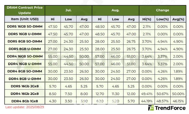 낸드플래시 역시 8개월 연속 가격이 상승하고 있다. 메모리카드·USB용 낸드플래시 범용제품(128Gb 16Gx8 MLC)의 8월 평균 고정거래가격은 전월보다 1.12% 오른 3.42달러다. 2024년 연말 2.08달러에서 꾸준히 상승세를 기록 중이다.