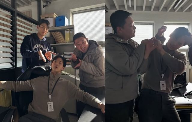 또 장동윤이 '사마귀'에 출연 중인 배우 김태정과 김민호와 함께 찍은 사진도 공개됐다. 극중에서 경찰 동료인 세 사람은 현실에서 더 친밀하고 유쾌한 케미스트리를 선보였다. 사진 속에는 김태정과 김민호가 장동윤을 가리키는 모습과 세 사람이 장난을 치는 모습이 담겨 훈훈함을 자아냈다.