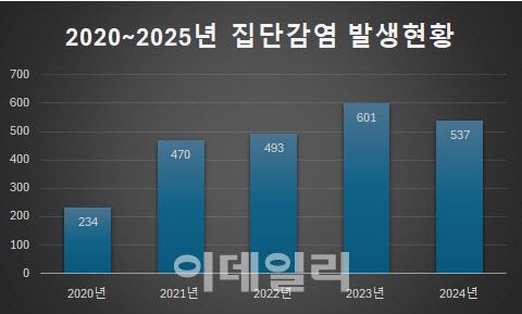 원인 병원체별 발생현황을 보면 노로바이러스의 증가세가 뚜렷했다. 2020년 51건에 불과하던 노로바이러스 원인 집단감염병은 2024년 203건으로 298%나 폭증했다. 같은기간 살모넬라균 원인 감염병 집단발생수는 19건에서 57건으로 168.4%나 증가했다. 이 외에도 클로스트리듐퍼프린젠스(7→15건), 바실루스세레우스균(4→12건), 장출혈성대장균(3→7건), 황색포도알균(2→5건), 불명(47→138건) 등도 있었다.