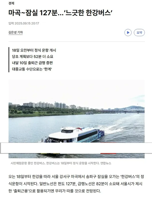 마곡~잠실 127분…‘느긋한 한강버스’ - 경향신문