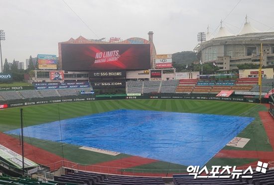 19일 오전부터 수도권 전 지역에 비가 내리기 시작했다. SSG랜더스필드에도 일찌감치 대형 방수포가 깔렸다. 오후에도 비가 계속 내리는 가운데 기상청에 따르면 늦은 저녁까지 굵은 빗방울이 내릴 것으로 예보됐다.