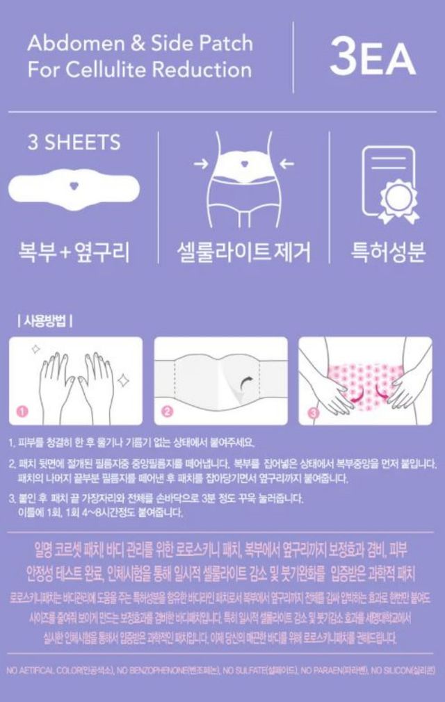 상품은 인체시험을 통해 일시적으로 셀룰라이트가 감소하고 붓기가 완화되는 것을 입증받은 과학적 패치라고 쓰여있으며, 피부 안정성 테스트까지 완료했다고 한다.