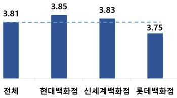 백화점 3사의 종합만족도는 평균 3.81점(5점 만점)으로 나타났으며, 업체별로는 현대백화점이 3.85점으로 가장 높았고, 신세계백화점 3.83점, 롯데백화점 3.75점 순으로 평가됐다.