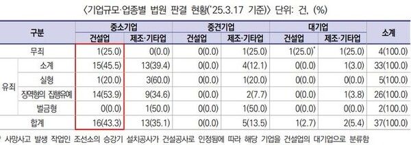 업종별 판결 현황을 살펴보면 건설업이 17건(46.0%)으로 가장 높은 비중을 차지했고 , 기업 규모별로는 중소기업이 29건(78.4%)으로 압도적인 비율을 보였다. 중소기업 유죄 판결 중 건설업이 15건을 차지해 중소 건설사 유죄 선고 비율이 높은 것으로 분석된다.