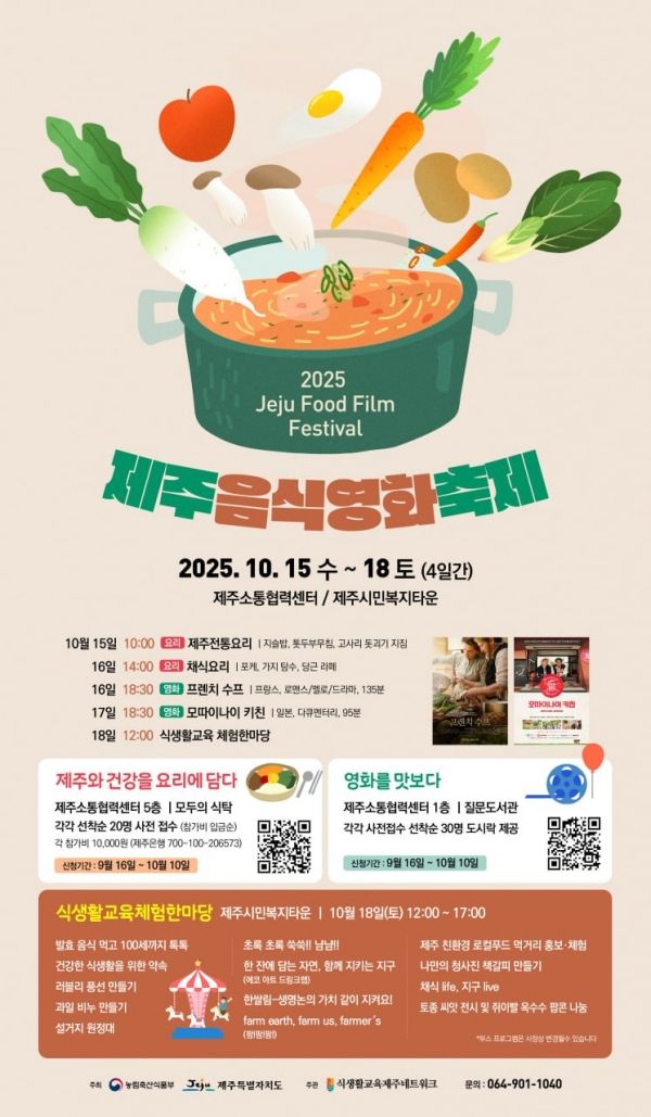 사단법인 식생활교육제주네트워크는 오는 10월 15일부터 18일까지 '2025 제주 음식 영화축제'를 연다고 밝혔다.