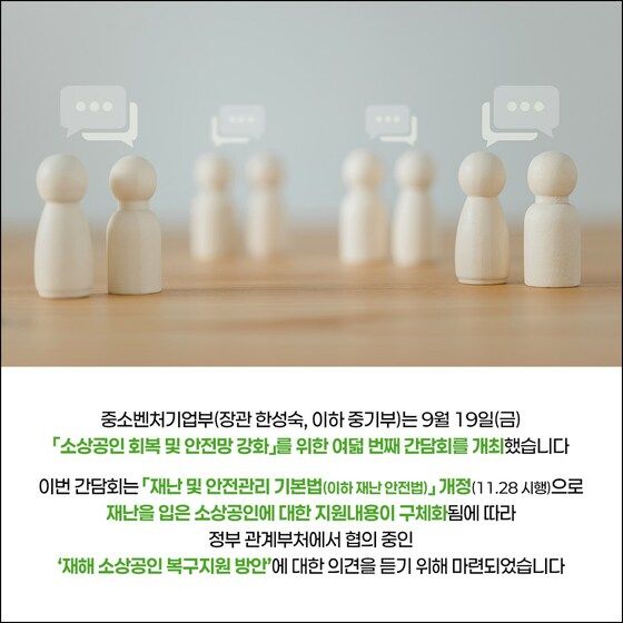 이번 간담회는 '재난 및 안전관리 기본법 개정'으로 재난을 입은 소상공인에 대한 지원 내용이 구체화됨에 따라 정부 관계부처에서 협의 중인 재해 소상공인 복구지원 방안에 대한 의견을 듣기 위해 마련했다.