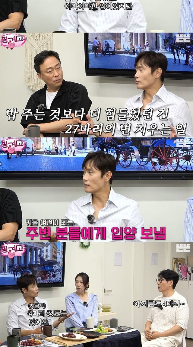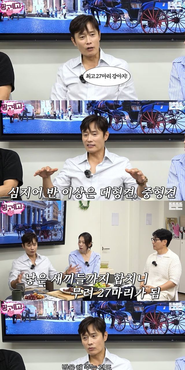 이병헌은 반려견 27마리에 대해 "반 이상은 대형경, 중형견이다. 새끼들까지 합쳐서 27마리였다"며 "밥을 해 주는 것도 어마어마한 양이었지만 밥보다 변을 치우는 게 엄청 힘들었다"고 당시의 고충을 토로했다.
