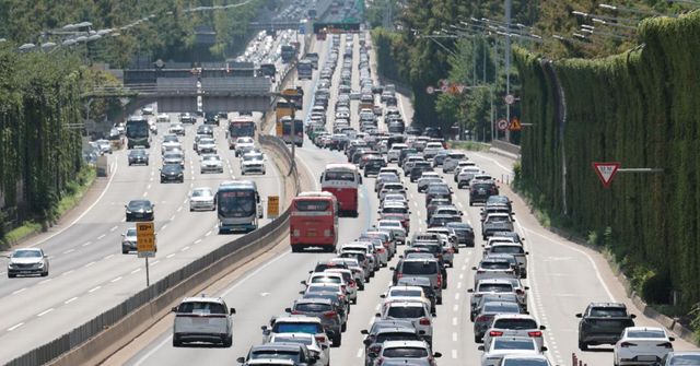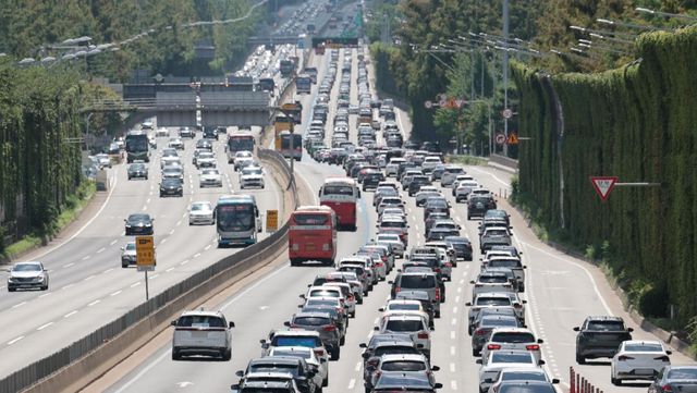 광복절 연휴 마지막 날인 지난달 17일 서울 서초구 잠원IC 인근 경부고속도로 상(왼쪽)·하행선에서 차량이 정체를 빚고 있다. / 연합뉴스