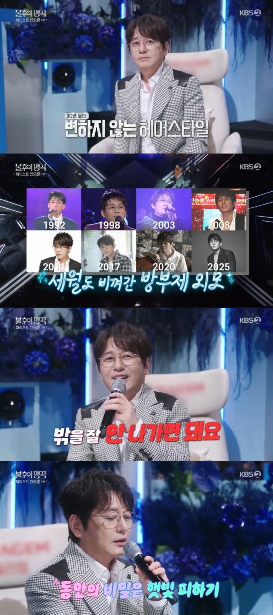 1966년 생인 신승훈은 올해 한국 나이로 60세, 만 나이로 59세가 됐다. '세월도 비껴간 방부제 외모'라는 수식어에 "피부 관리는 밖을 잘 안 나가면 된다. 무조건 자외선인 것 같다"고 말했다.