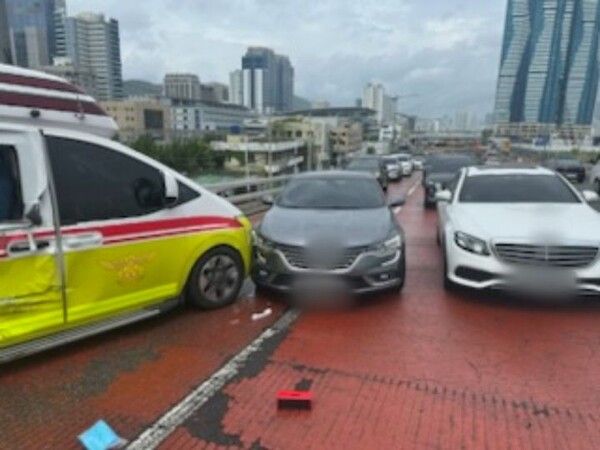 뉴시스 보도에 따르면, 21일 부산경찰청에 따르면 지난 20일 오후 1시10분께 부산 중구 영주고가교에서 부산역 방향을 달리던 119구급차가 빗길에 미끄러져 정차 중인 승용차를 추돌했다.